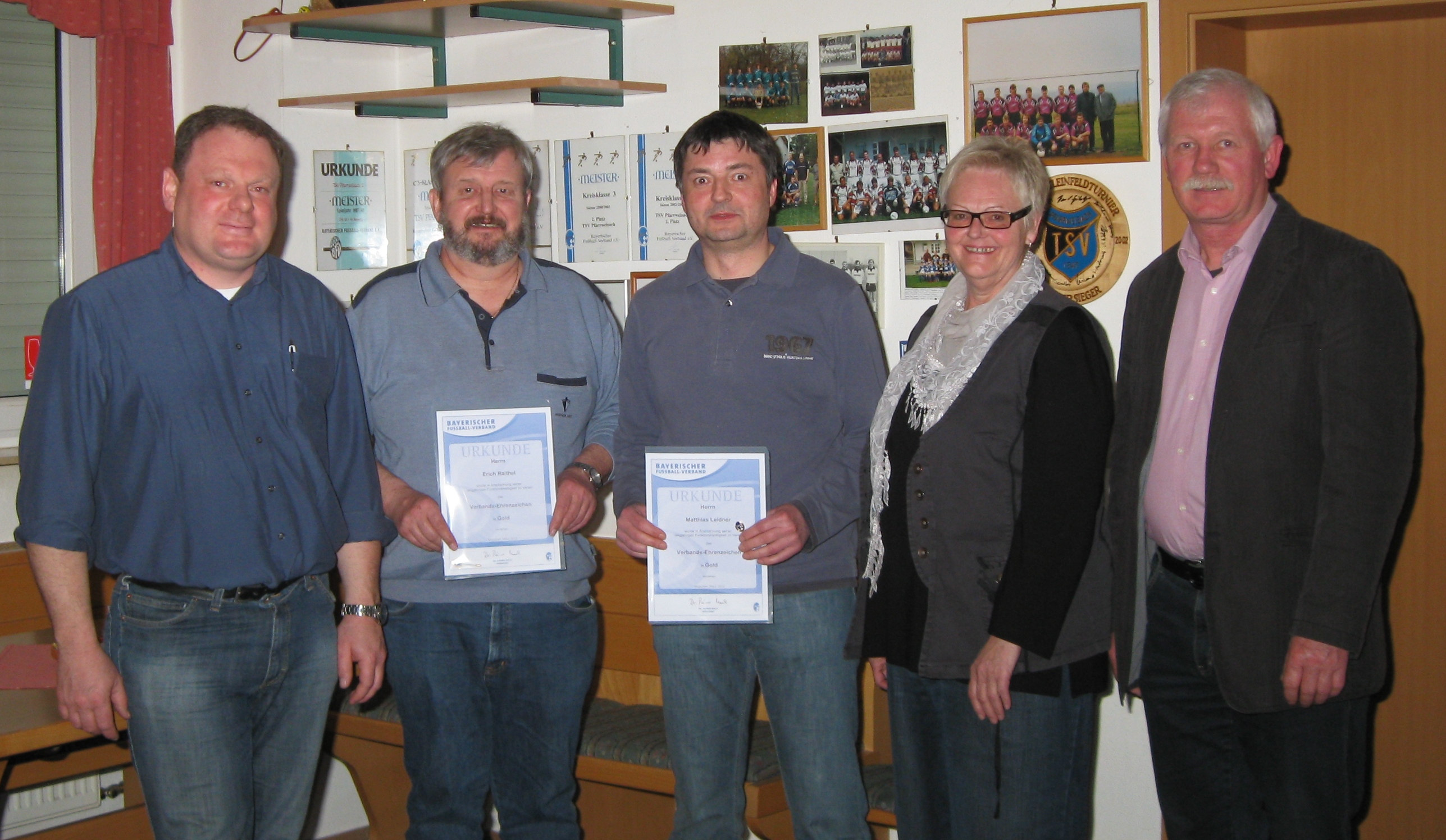 Während der Jahreshauptversammlung überreichte Margot Härtlein als Kreisehrenamtsbeauftragte den beiden langjährirgen Vereinsmitgliedern Erich Raithel und Matthias Leidner die Ehrenamtsurkunde in Gold.